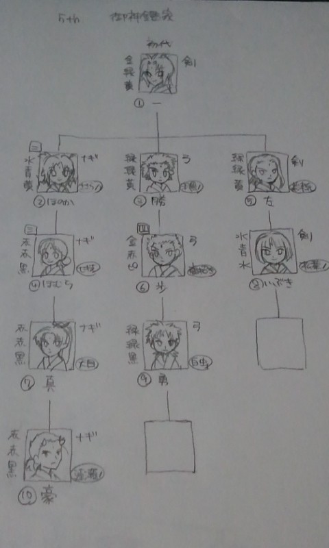 PS版当時、人に俺屍すすめる時に必ず「家系図手で書きながらやった方がいいよ!」と言ってたんですが、PSP版で少し見やすくなったもののゲーム中の家系図が見づらいことに変わりはないので、また初心に帰って手描き。ゲーム画面の写真と見比べると絵が歪んでて吹きますよね(?)